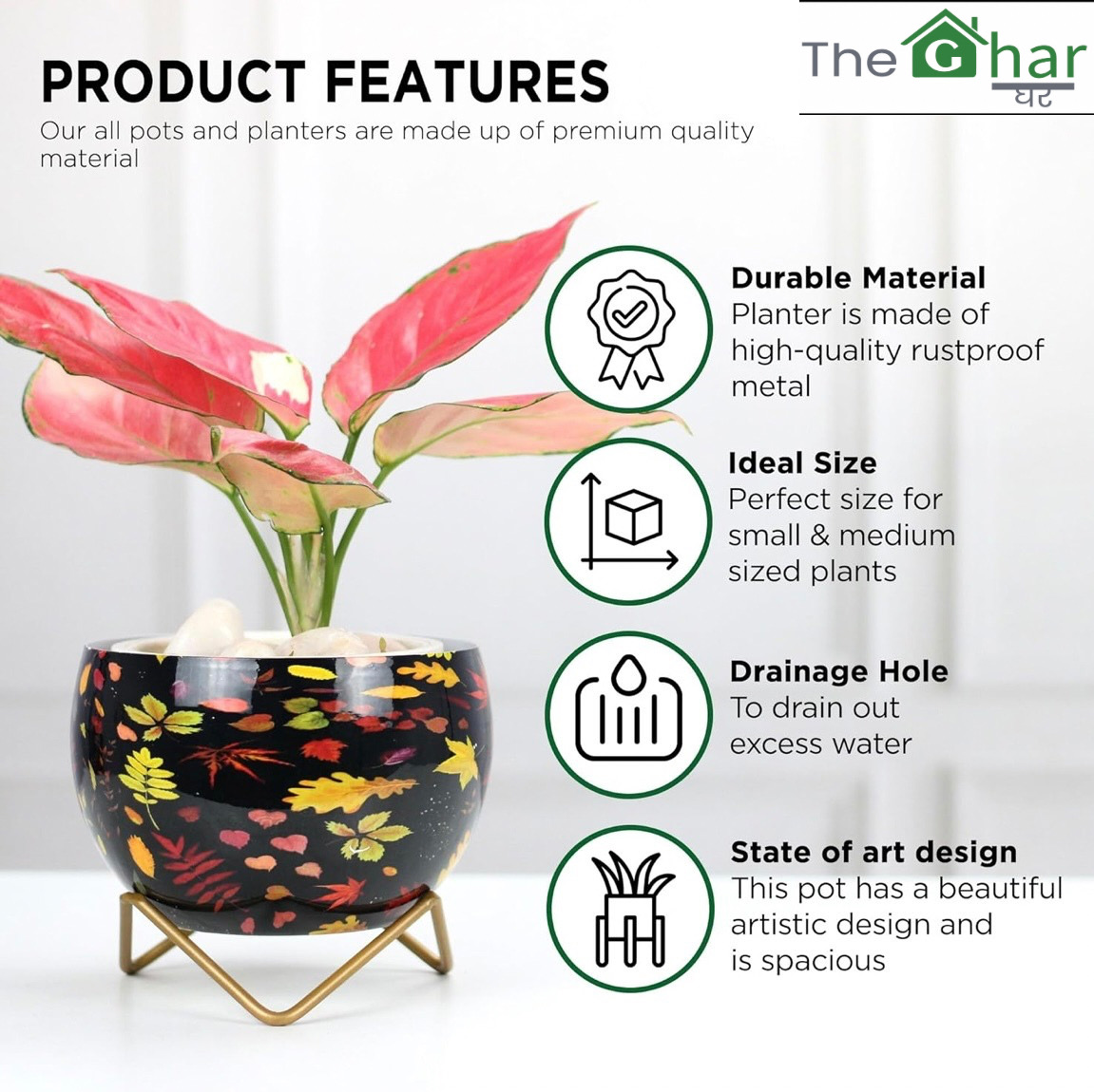 A Decorative metal bowl or container with a rounded shape and a glossy black finish, adorned with a vibrant pattern of multicolored autumn leaves in red, yellow, and orange tones. It sits atop a sleek, modern metallic gold stand with a geometric design that adds both stability and visual appeal. Ideal for use as a stylish accent piece in home or office decor.