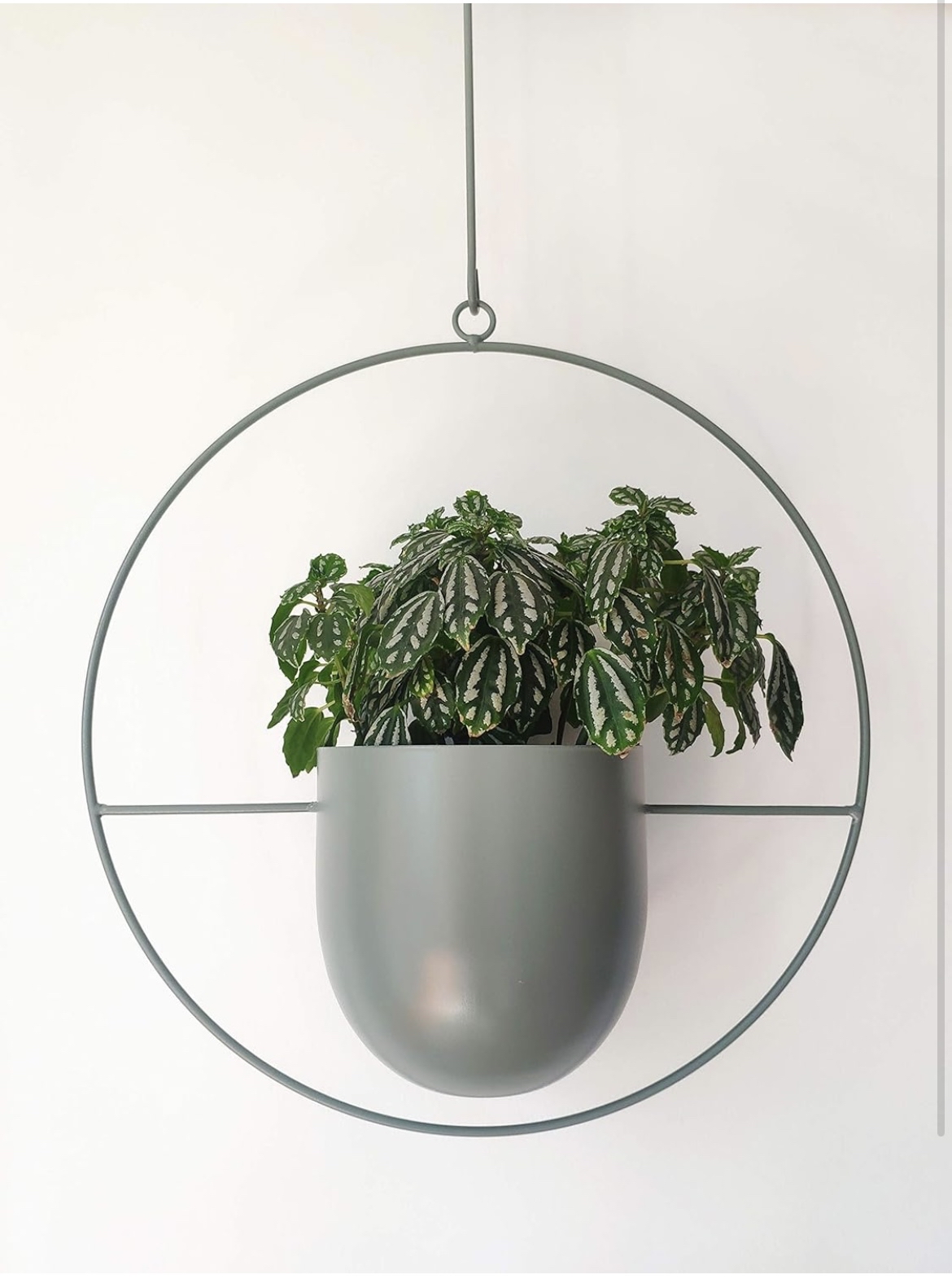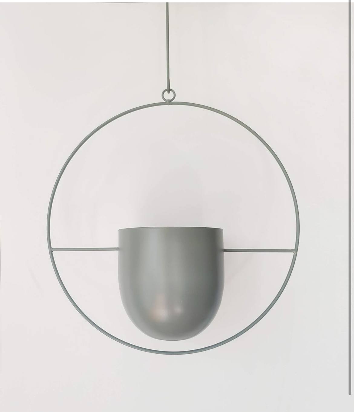 This is a modern, minimalist hanging planter with a sleek, matte gray finish. The planter is suspended within a circular metal frame, which is attached to a thin rod for hanging. The geometric design features a half-sphere pot that seamlessly blends into the circular frame, creating a balanced and aesthetically pleasing composition. This planter is ideal for contemporary interiors, adding a stylish touch while keeping the focus on the greenery it holds.