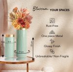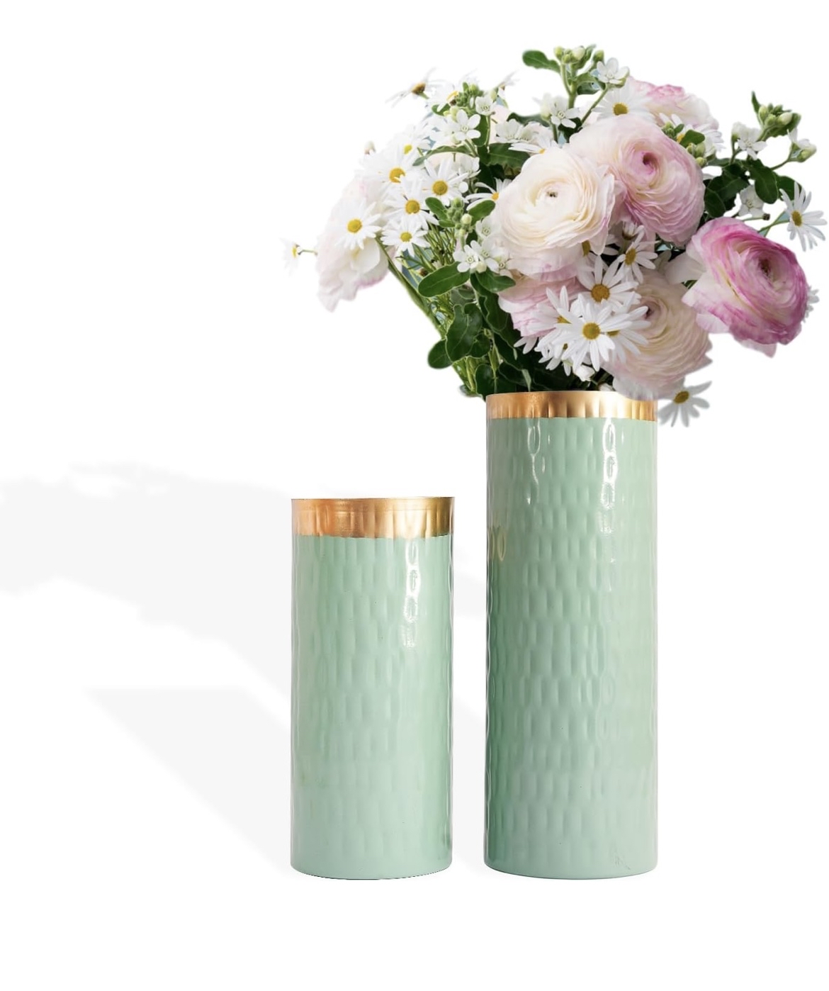 This product is a set of two elegant ceramic vases featuring a tall cylindrical shape with a textured mint green glaze and a metallic gold rim. The vases are designed to add a touch of sophistication to home decor, making them ideal for displaying fresh flowers, dried arrangements, or as standalone decorative pieces. The contrasting combination of the soft green and the shiny gold accent makes these vases suitable for modern, contemporary, or even classic interior styles. The varying heights allow for dynamic visual interest when displaye