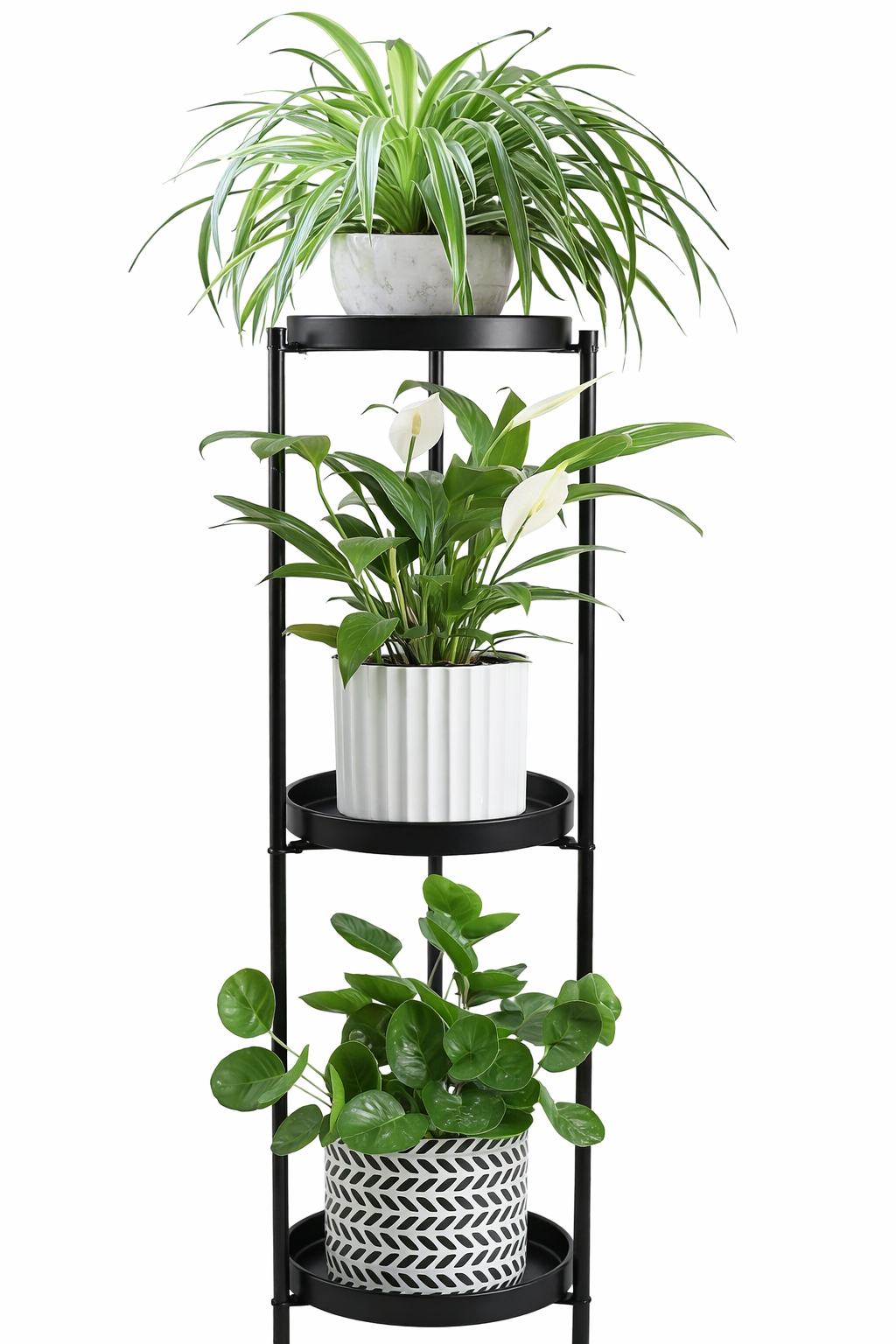 Maximize your plant collection with this sleek black metal tiered plant stand, offering three levels of display space. At H 86cm x D 25cm, it accommodates various pots for orchids, ZZ plants, or pothos as shown in the image.