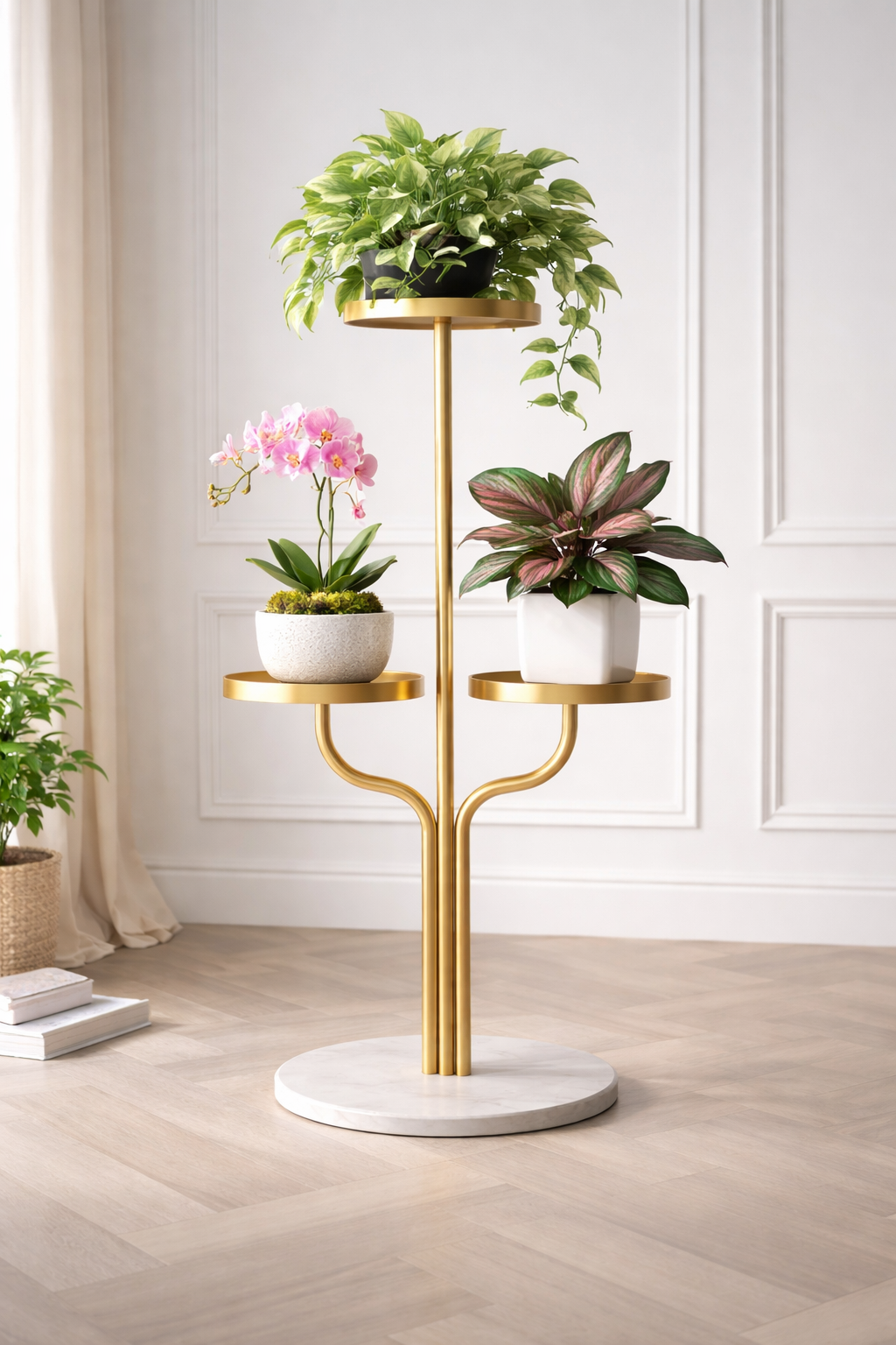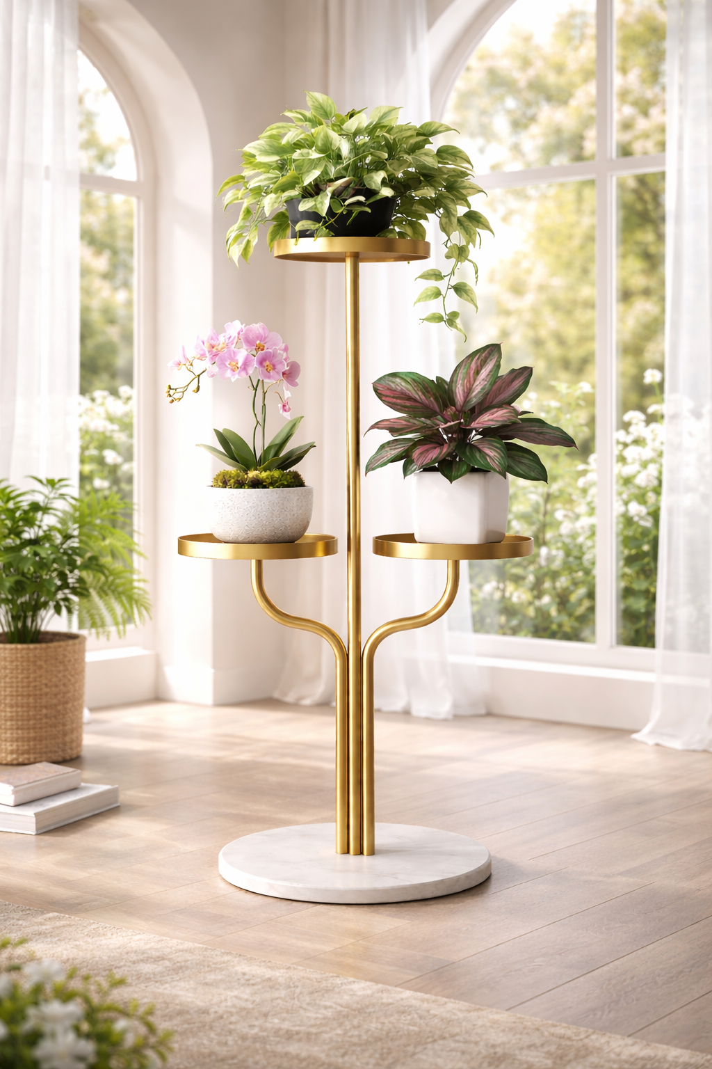 Crafted from premium gold-finished metal with a luxurious white marble base, this tripod-style stand offers sturdy support for three pots in varying heights. It showcases lush greenery like trailing vines, orchids, and ferns, creating a vibrant indoor garden focal point without overwhelming small areas. The arched, elegant design blends modern minimalism with opulent glamour, ideal for living rooms, balconies, or corners.